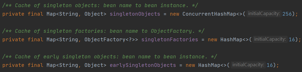 可以看到是从singletonObjects中get出来的,这个属性就是一个Map,我们可以看到除了Bean容器外还有一些其他容器也是Map