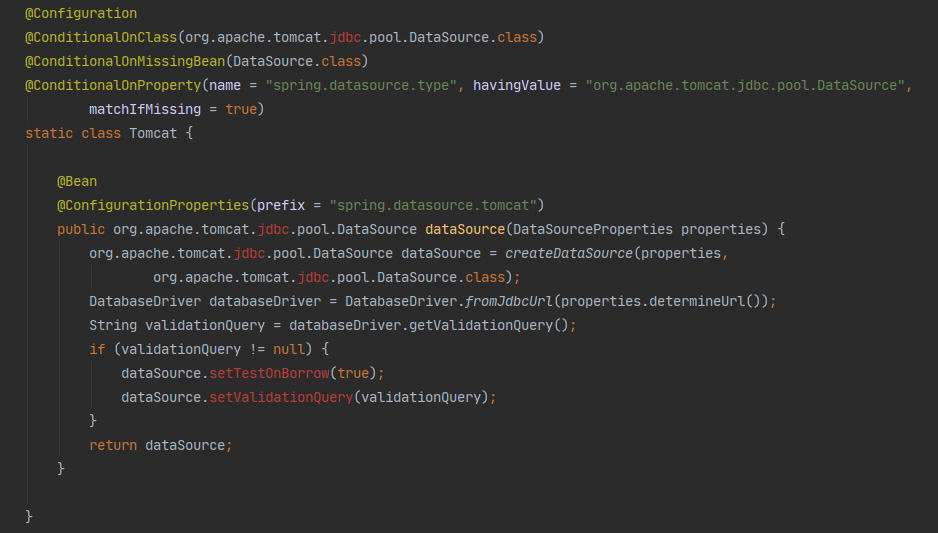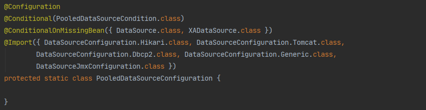接下来点进去DataSourceAutoConfiguration类,可以看到其内部类PooledDataSourceConfiguration中有如下几个注解