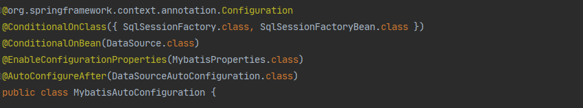 可以看到在类上有这样一个注解@AutoConfigureAfter(DataSourceAutoConfiguration.class)表明当前类是在注解中指定的类加载后进行加载的
