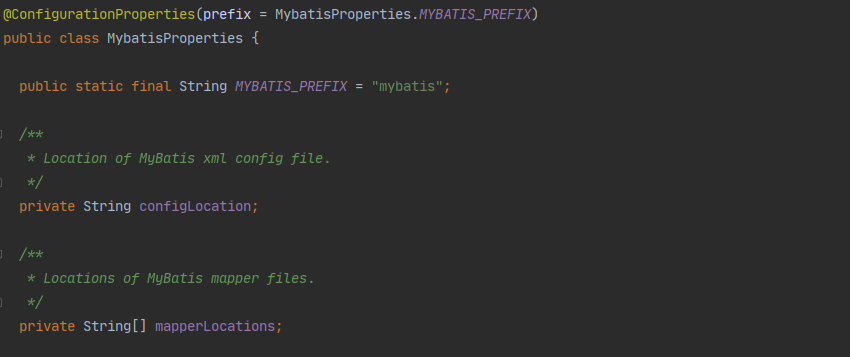 在这个类中会读取配置文件中以mybatis开头的属性设置到当前类中,同时可以看到mapperLocations属性,这里就是存储我们配置的mapper-locations属性对应的mapper文件