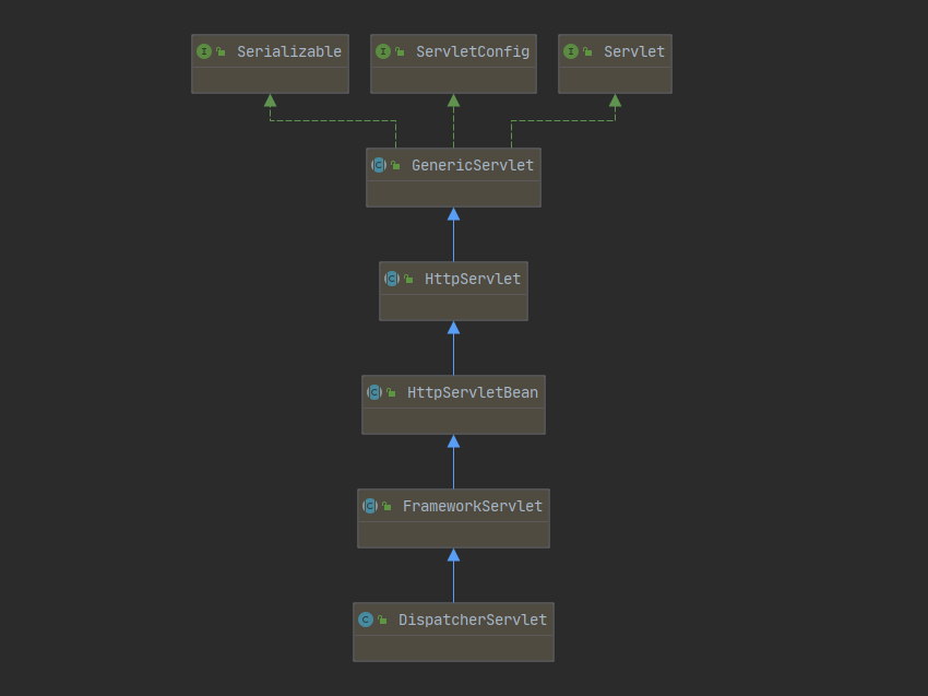 DispatcherServlet --> FrameworkServlet --> HttpServletBean --> HttpServlet --> GenericServlet,而GenericServlet最终实现了Servlet接口