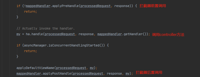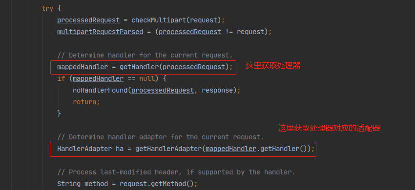 从名称上看开始对请求进行分发了,其中两个方法比较关键,一个是getHandler,获取当前的请求的处理器,一个是获取处理器对应的适配器