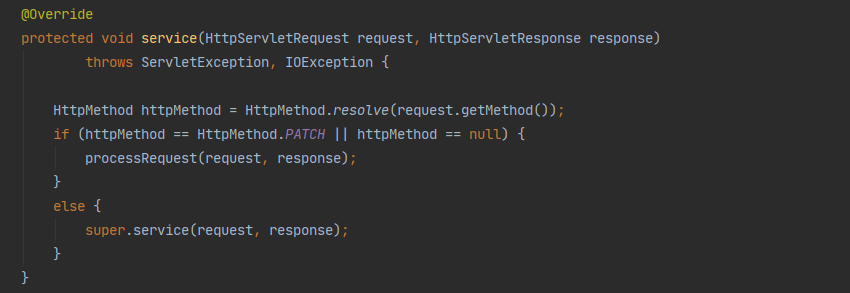 然后继续调用service(httpServletRequest, httpServletResponse)方法,由于在FrameworkServlet复写了该方法,因此优先调用子类中的方法,在子类中只做了一件事,判断是否是patch类型的请求。