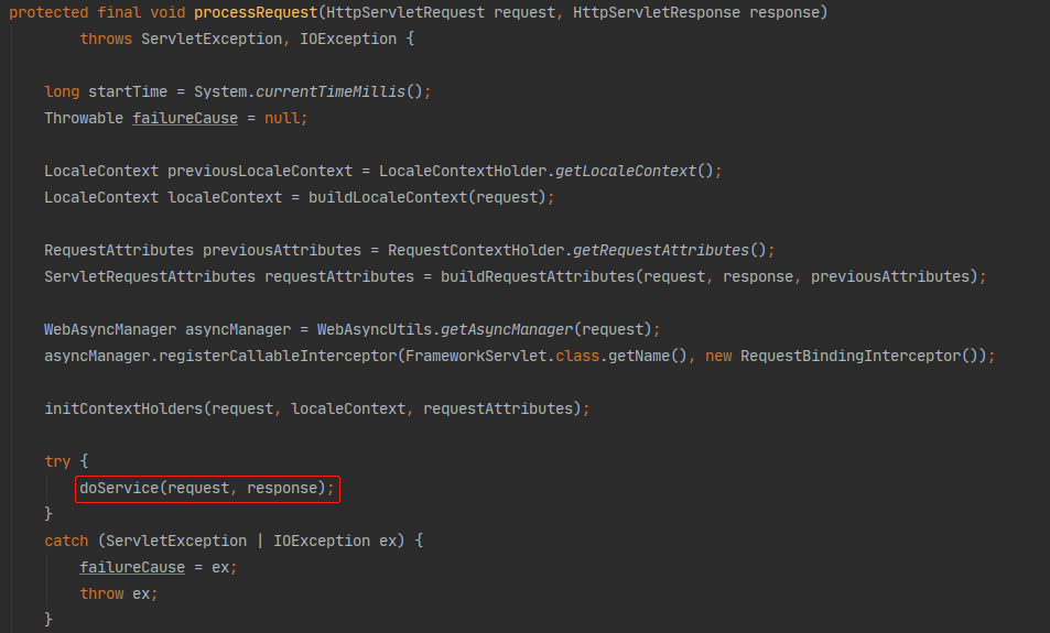 点进去继续看,在这个方法中,初始化了一些属性值这里我们不过多关注,只看主流程,真正处理请求的是doService(request, response)方法