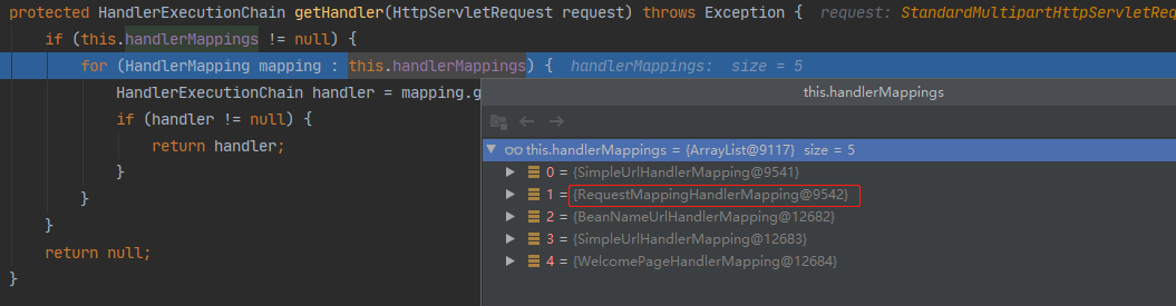 通过debugger可以看到,Spring将所有的URL映射关系全部放入一个map中,在这个方法中将当前请求路径对应的bean拿到