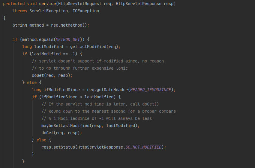 在父类中的对请求类型进行了判断,如果是post、put、delete则不作其他逻辑判断,直接调用doPost方法即可,如果是get请求,则通过判断http中的if-modified-since属性来决定是否对请求进行处理