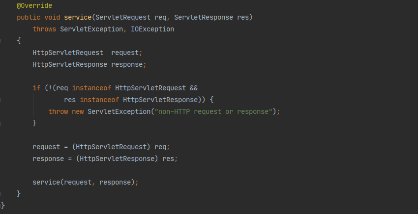 由于我们已经知道处理请求的关键是Servlet中的service方法,因此我们直接去找这个方法,可以看到这个方法最后一次复写是在HttpServlet类中(注意Servlet中的service方法参数是ServletRequest和ServletRequest类型)