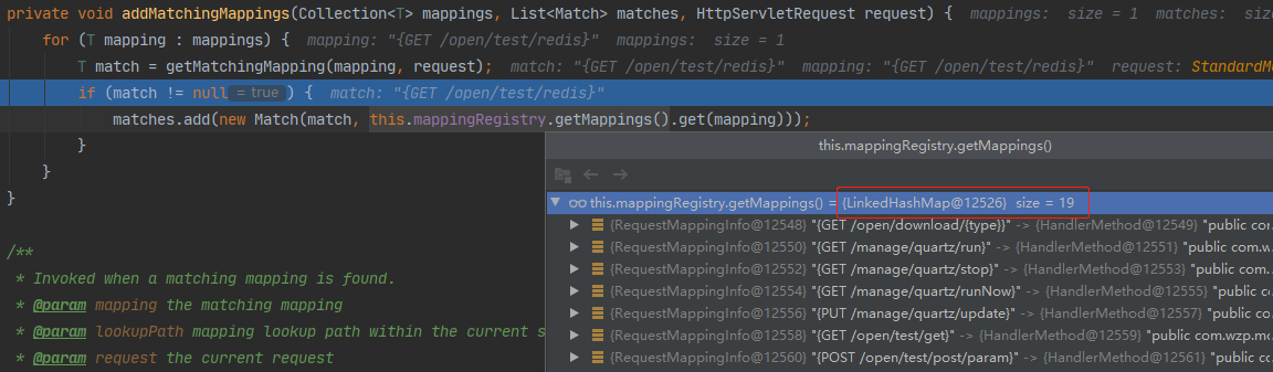 mapping.getHandler在这个方法中,通过往下调用,最终会调用到AbstractHandlerMethodMapping这个类中的addMatchingMappings方法