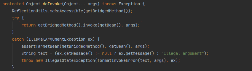 在这个方法中通过一层一层调用最终执行到这样一个方法,在这里进行反射调用,执行了最终controller方法,我们定义的controller流程执行完了