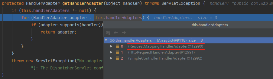 接下来我们在关注getHandlerAdapter这个方法,这个方法是获取处理器对应的适配器,在这个方法中依旧遍历已经初始化好的适配器,显然这里使用RequestMappingHandlerAdapter