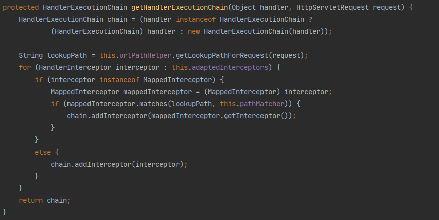拿到bean后,我们返回到getHandler方法,继续往下走,发现这个方法getHandlerExecutionChain返回了一个HandlerExecutionChain,在这个方法中,只做了一件事,就是找到这个URL匹配的拦截器